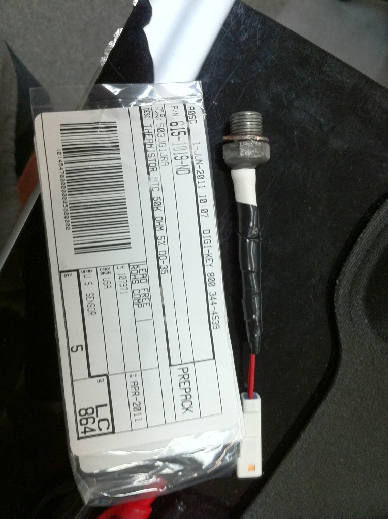 Got alot done today. First up, the koso temp sensor died from what i expect were out of its range. So i found another thermistor that had the same curve (i measured using the one I still had) that had a higher max temp. I took this guy (0.80 each at digikey, 6141019-nd) and stuck in in a drilled out Porsche head temp sensor and jb welded it in there. FYI, jb weld is a electrical insulator, and reasonably good thermal conductor.