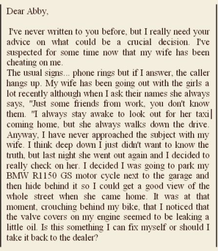 lol.... my wife is cheating on me dammit.....but can i fix the valve cover gasket on my boxer myself? didn't see that one coming when i was reading the article