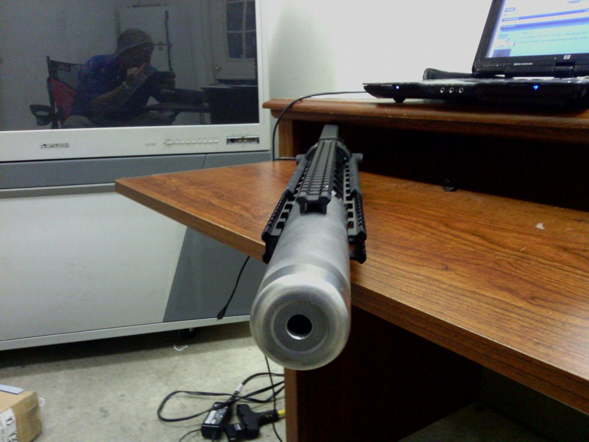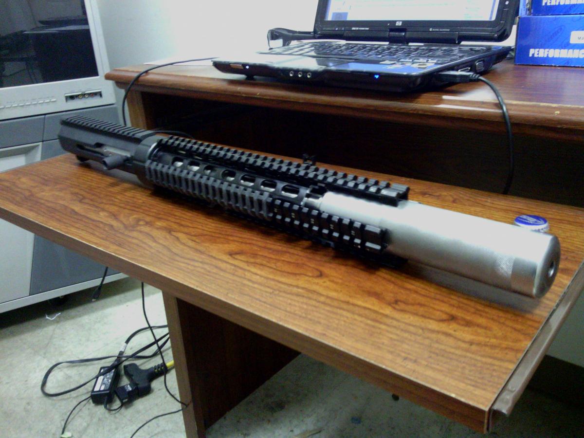 300AAC BLK upper with Soundtech Suppressor pinned on a 10.5" (didn't want to wait 6mo for SBR paperwork), OPS-4 upper reciever with ambi-bolt charging - yeah, better watch the way I shoot it. Need to paint and the the lower on for a full photo shoot. Subs to come in Monday.