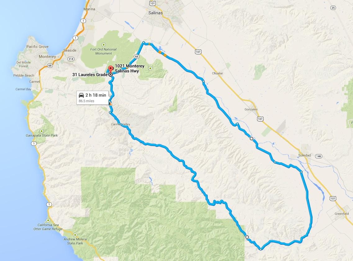 That's Highway 68 @ Laguna Seca -> Laureles Grade -> W Carmel Valley Rd -> E Carmel Valley Rd -> Arroyo Seco Rd -> River Rd -> back to Highway 68. Its scenic enough for a trip around the Gabalan range. Really its just a hell of a lot of fun. Two lane backroad thrashing at its best. Warning though, the road is a bit rough in some places. If you wreck/breakdown/die on E Carmel Valley Rd or Arroyo Seco, no one will ever find your body. No cell reception out there either. Google massively underestimates the drivetime, its more like 2.5-3 hours and that depends on how brave you are in the corners. Good news is the River Road section is part of the "Monterey Wine Country" tour.