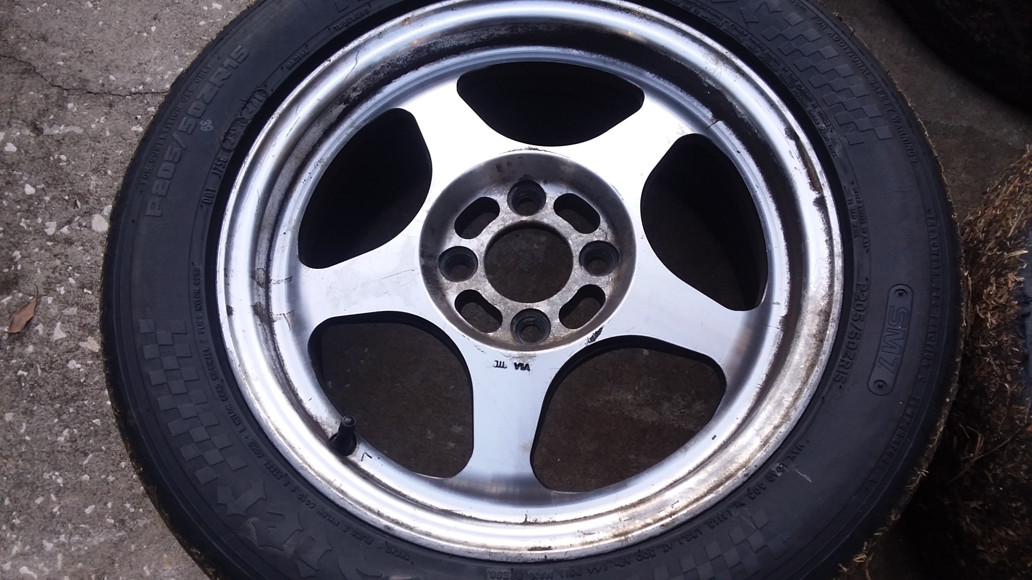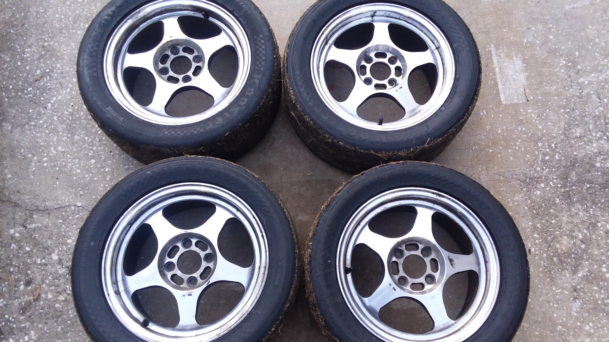 I usually keep two sets of spare wheels when I go to the track. I'm buying another set now and won't have room for all of them. I've decided to sell my trusty Rota Slipstreams which are shod with a good set Hoosier sm7 with only 6 heat cycles. The clear coat has been bad on these wheels since the day I got them but they are very light, straight, and true. They fit over my V8R 11.75 big brake kit with only one 5 mm spacer.