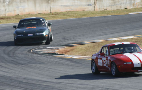 I will say this- the quickest way around Rd. Atlanta in a Miata requires being all over the rumble strips. Or in turn 5's case, it requires driving across them to the no-man's-land, onto the cut through asphalt and then re-entering the track at the top of the hill. For maximum speed my right tires will literally jump the gap between no-man's-land (the painted concrete outside of the T5 exit rumble strips) and the cut through asphalt. And shortly after that will be the rev limiter in 3rd. Would I want to ride with a student on that line- hell no!