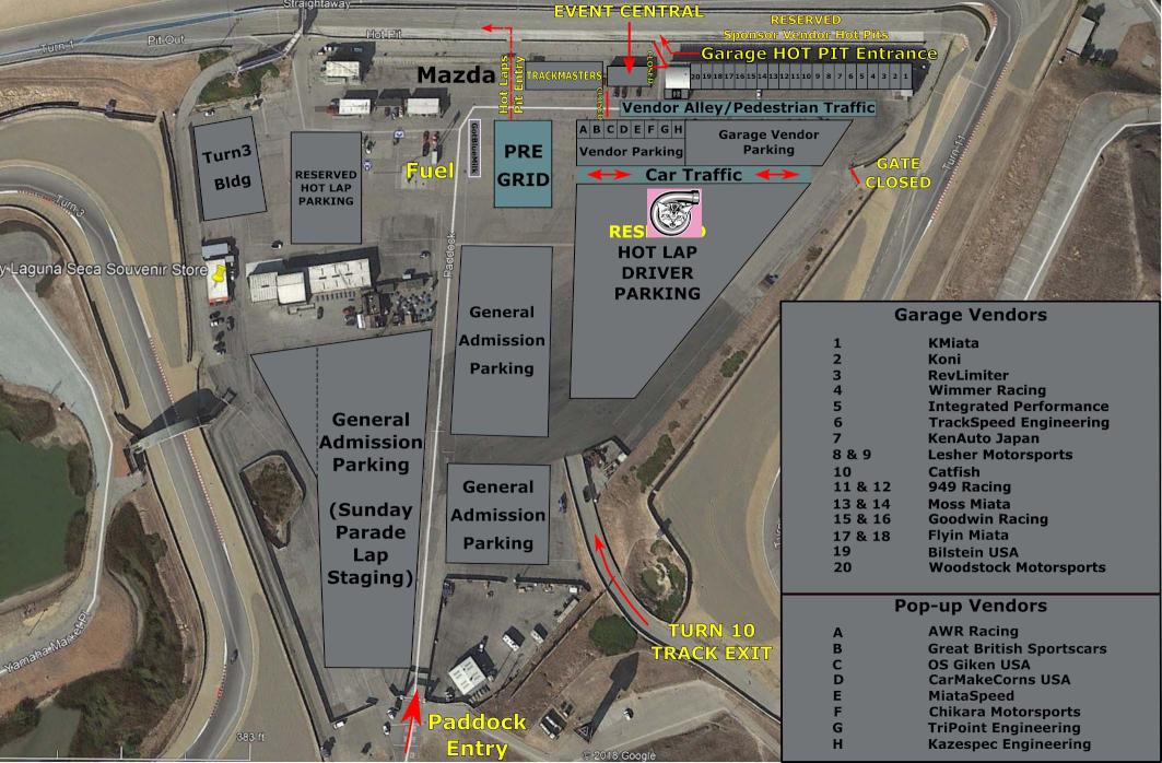 I'll be getting there Friday afternoon (as soon as they'll let me into the track, which is probably 5, given the TMR event that day), and will try to stake out a lot. I'll aim for around our usual area, but it looks like they're now reserving the very front row for more vendor stuff, so we might wind up having to shift backwards. Target area here: