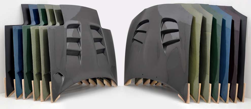 The colors, they are different carbons. There's a blue carbon, green carbon, Kevlar, silver carbon, and on the right, you'll see a red carbon (looks purplish in the pic). They just did different colors for those that want to show off carbon, but have it close to paint matching.
