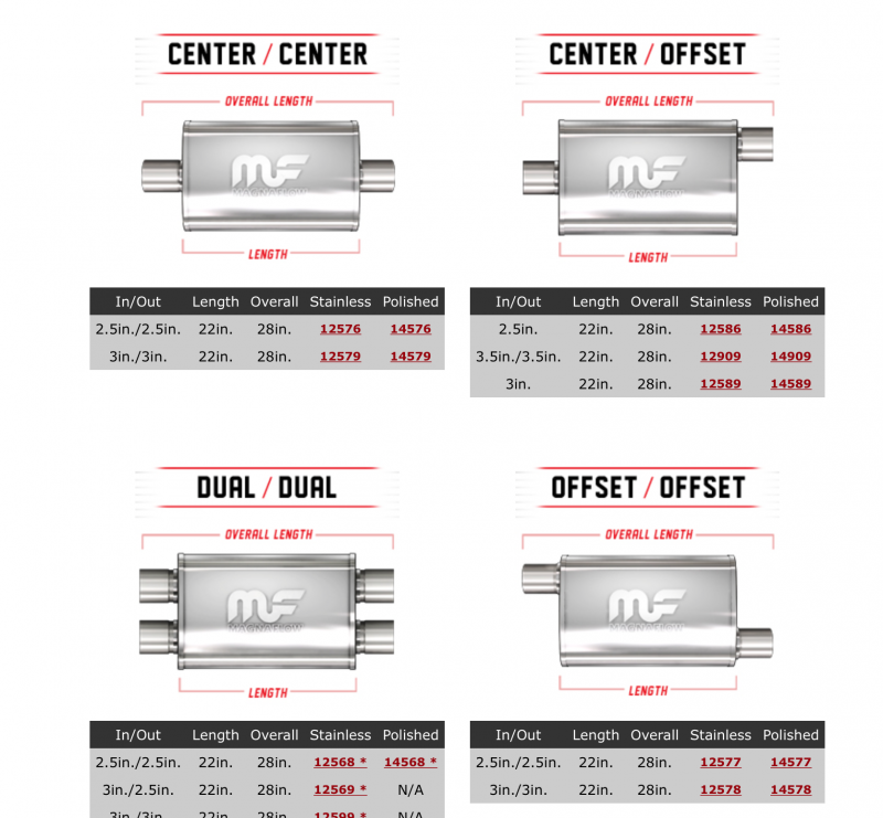 I really like to try these muffler, and I was wondering which 5x11x22 magaflow you guys are using. Seems like there are 3 types, center/center, center/offset, offset/offset.