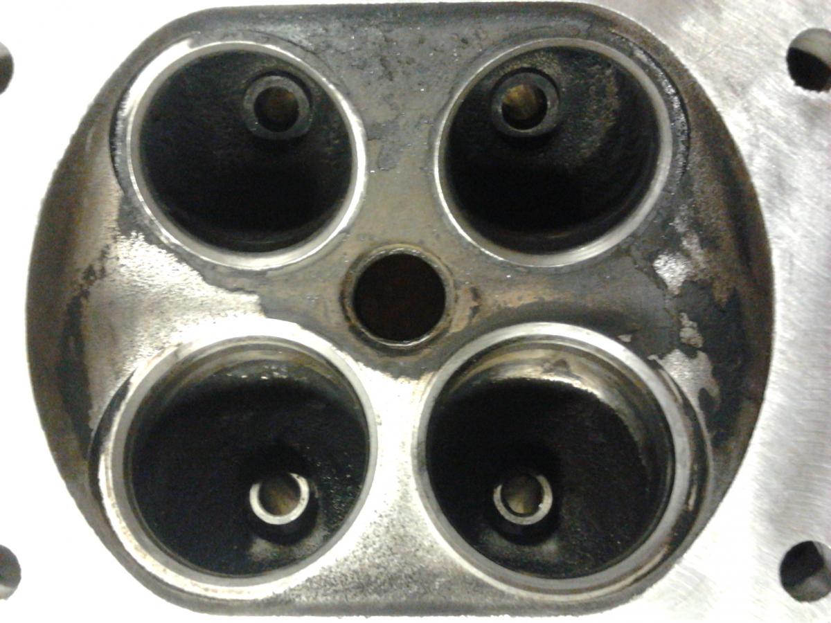 Here are some pics of the lobotomy. The valves and caps will be going to work with me tomorrow so I can de-carbonize them on the wirewheel and clean them in the parts washer. Lapping (can I say lapping Rick?) and final assembly will be done at home. I may even try my hand at some porting but probably not.