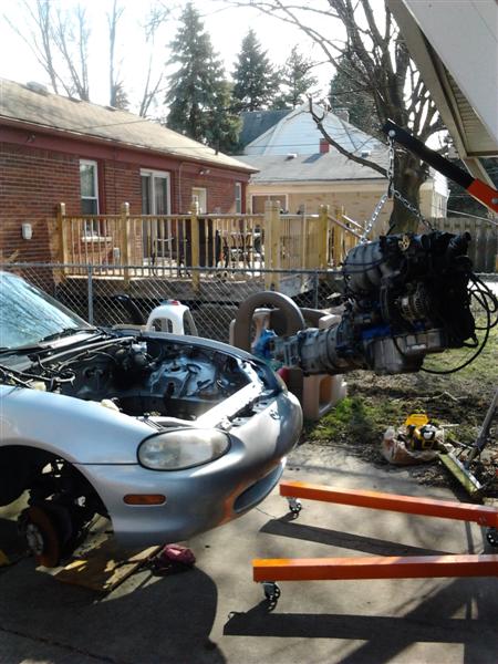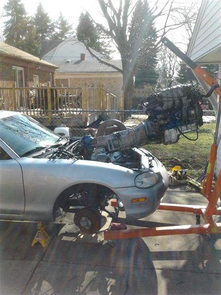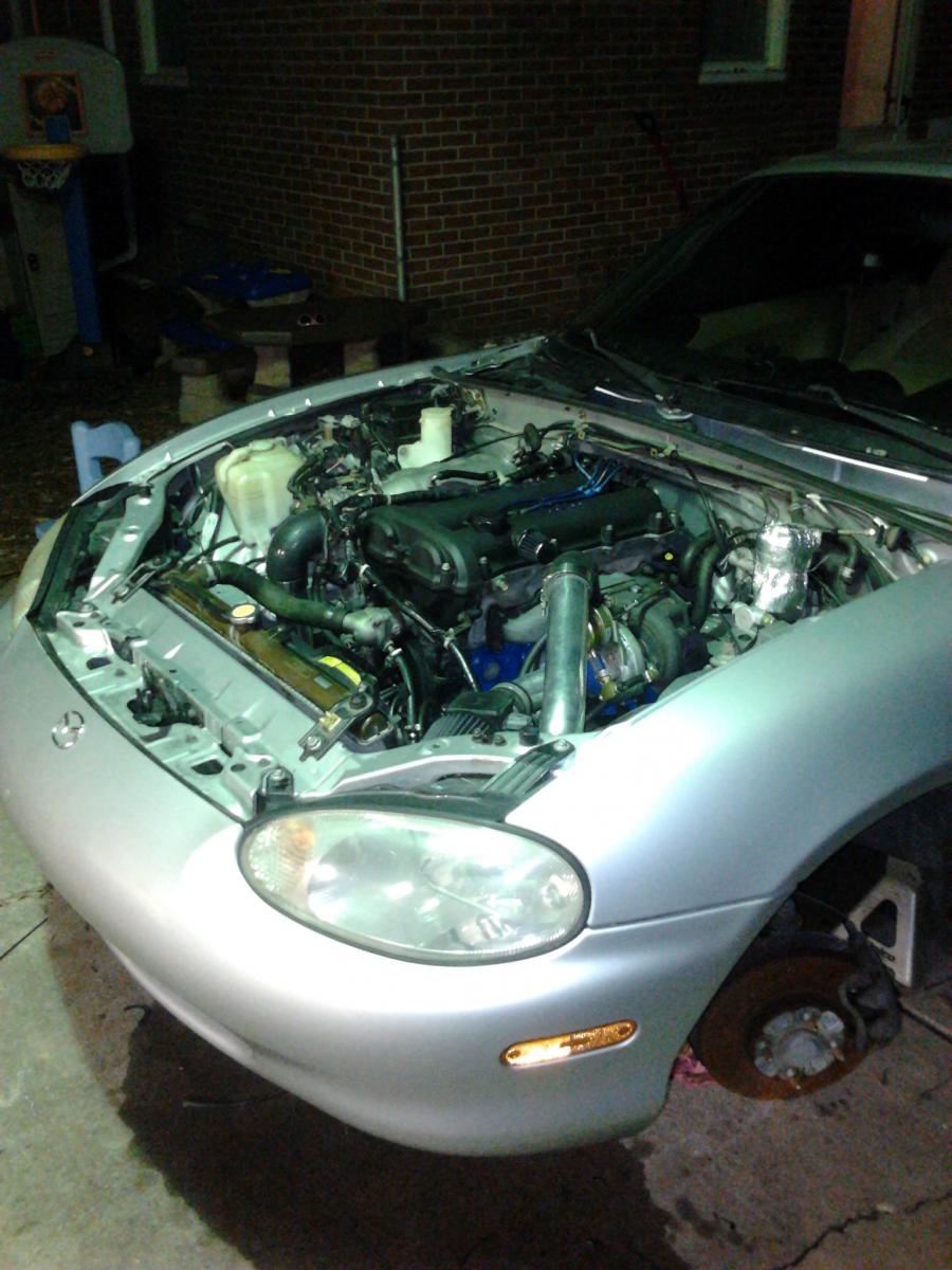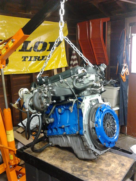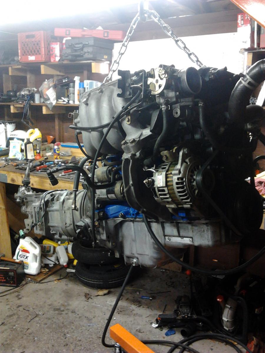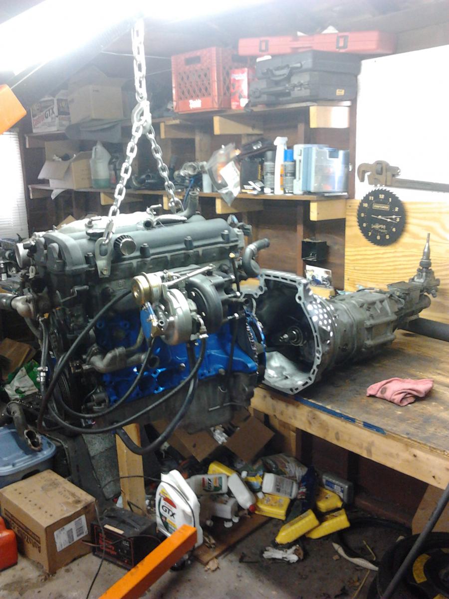 Well, I got more done today then I thought I would. Engine is in and the engine mounts are installed, I still need to bolt together the ppf, install the driveshaft, exhaust, radiator, IC piping, etc, but most of the wiring is connected so I am hoping to have it idling by tomorrow afternoon!