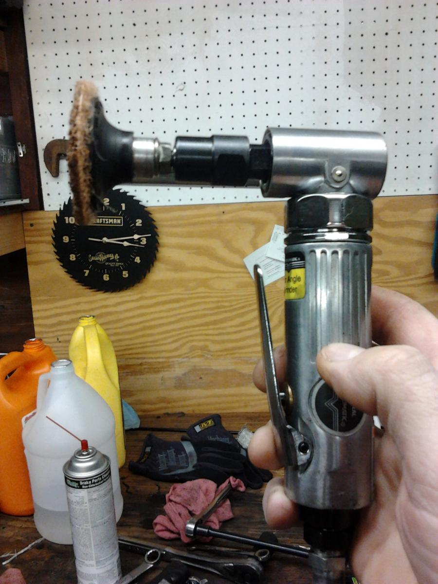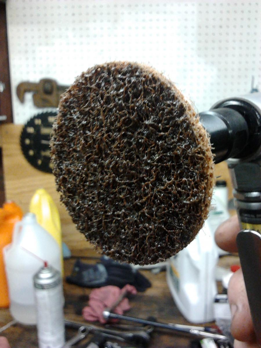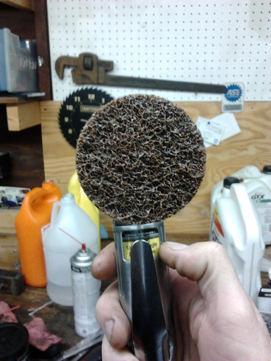 Use this exact disc. It's good for the block and head, and anything else on your engine for that matter. Don't use the green hard discs, those cut away too fast and will mess up aluminum pretty quick. Just make light sweeps until the surface is clean and even looking. You don't need to run the grinder at full speed, I usually turn down the regulator on my compressor to about 40-50psi.