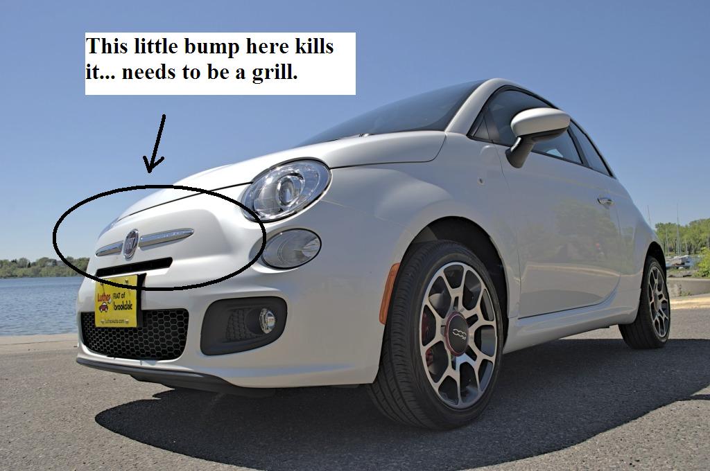 Edit: from the headlights forward kills the stock version. From rear-quarter shots where you can't see the front, it actually looks fine... but the little pug-butt nose bump just crushes the lines for the front of the thing. The wider lower grill section on the Abarth kinda helps... but it's not much better.