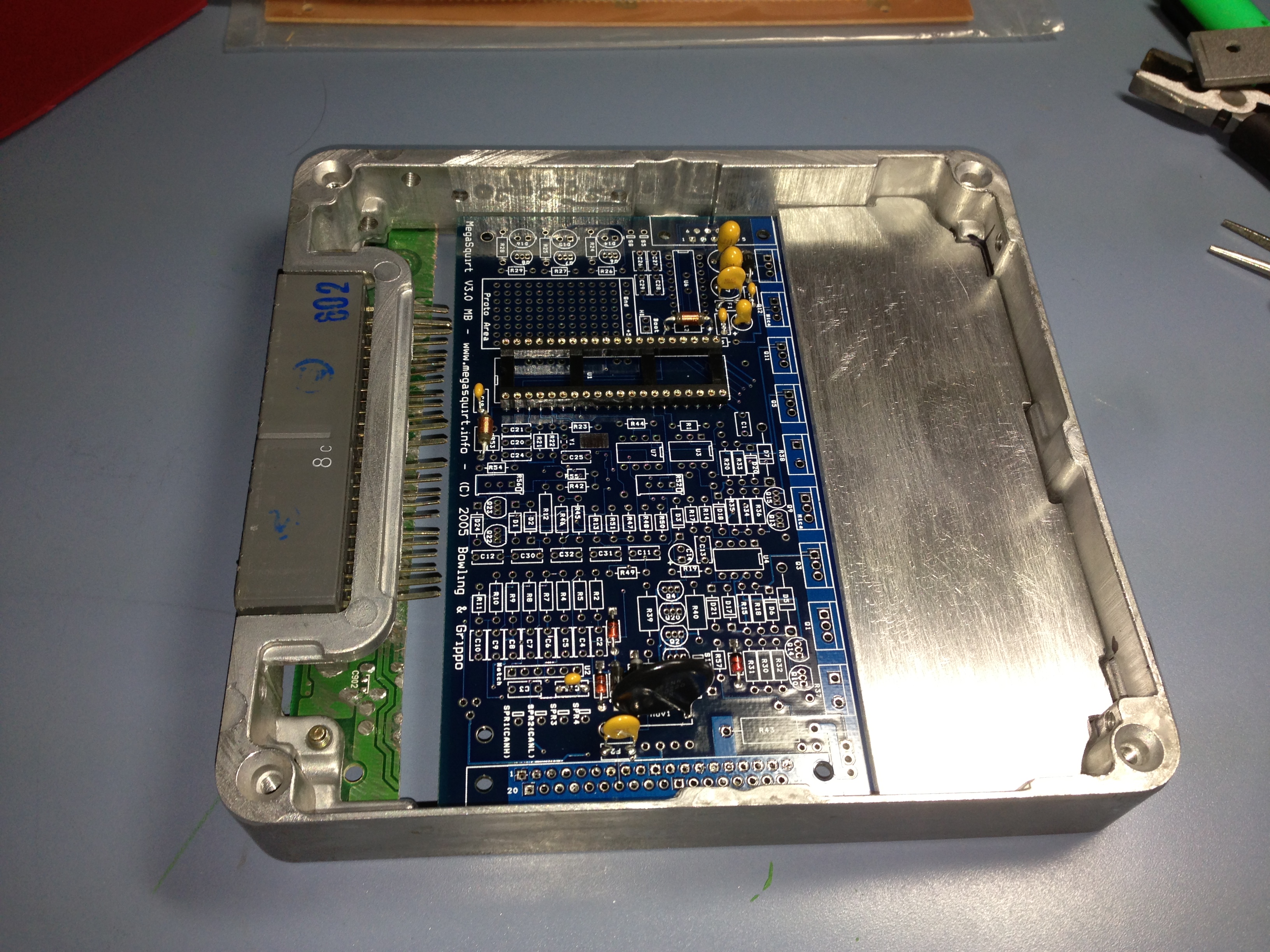 The Mega Squirt board fit perfectly inside the stock 1995 case, although if I did it again, I would make the heat sink a bit smaller, so that there was a bit more room on the socket end of the case, I will most likely cut that later, just to clean it up.