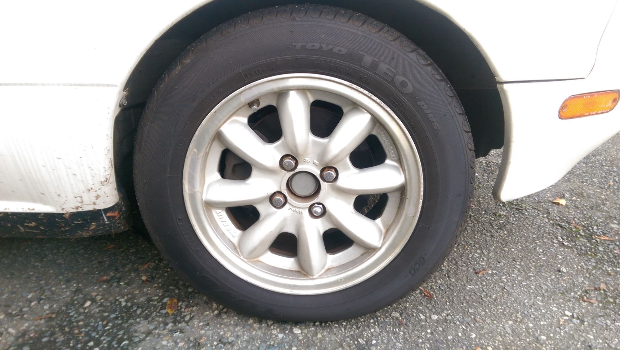 The car came with the sweet 14x6.5 Panasport Prorally wheels. I had to swap out the very nice Toyo's because they don't have a "DOT" marking on them so I can't pass the inspection with them. Plus I have a lot of winter driving through the mountains in BC so on went a set of 175/65/14 snows. Other modifications made by the previous owner were a Nardi wheel that is showing its age and a REALLY REALLY neat Mazdaspeed catback that has the perfect sound to it. I really really really don't want to remove it when I put a turbo on the car down the road but we'll see.