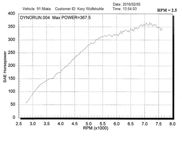 Most of the pics can be found in my profile photo album, running FIC 750cc injectors, 15g greddy turbo.Yes buffon, the walls are thin, but they still have enuff left to hold the boost, i've done a lot of research in how I went about building my miata. This is my 3rd miata. I love them. Effini, thats cool your from cedar rapids, email me so we can go cruise, looking for some more peeps with miatas to have a topless cruise, my email is lovinluxy@yahoo.com. I am a newby to this forum stuff so please be patient everyone. Thankyou for your replies, also, dyno graph is in my profile album photos too.The reason for the build is because car was running 12 psi boost on stock internals and..... yea, then came the knock because knock sensor went bad.
