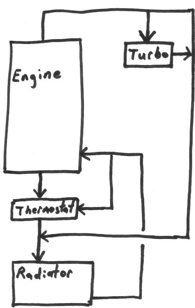 The PO set up everything on this car so i don't know what the original intention was but I traced the lines to coming from the back of the head, splitting with one loop going through the turbo and a parallel loop bypassing it. Then they join again at the front of the engine as you see in the pictures.