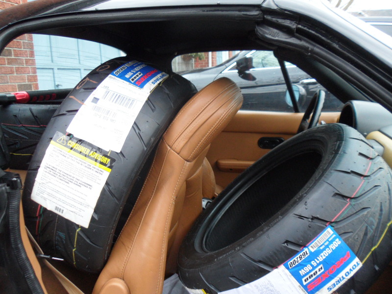 @Udlose: I wish I had gotten a picture of the Miata fitting in 2 wheel assys, 4 loose tires, 2 loose wheels!!! That's pretty much the MAX you can fit I believe in the Miata. I struggled with the last tire and had to force it in passenger side against dash lol