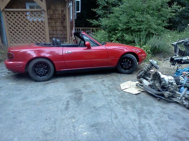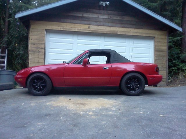 Hi forum! I've had my '97 for a little over 2 years now, and in that time clocked 40,000 miles on it, almost all of them in miata territory. It now has 110k. I've replaced the top, the timing belt, water pump, brake pads (2x) and rotors , tires (4x), the radiator with an double row, clutch slave, all the hoses, the differential (had an open, tried a rx7 clutch type, and settled on a torsen) and run almost every logical (or illogical) combination of suspension parts you can use on kyb GR2s or NA bilstein coilover assemblies (suspension is my fascination).