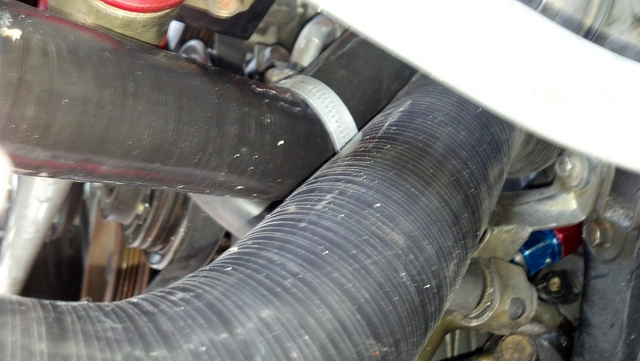 If I adjusted things back to prevent rubbing, it'd push the hose into the accessory belt. Probably not a good thing.