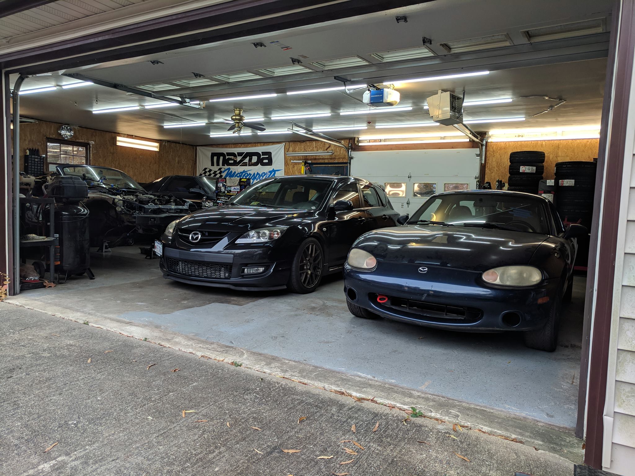 I know everyone likes pictures, so here's a quick shot of what I have going on in the garage right now. The NB1 on the right is the track car, Mazdaspeed3 is my daily driver and Tail of the Dragon slayer, that's a stripped down NB2 on the front left that I bought to part-out or hold onto stuff for potential turbo build, and in the back is a MKIII Supra that I'm building for a buddy to also compete in NASA TT. I also have another Mazdaspeed3 currently in for an engine rebuild. Luckily my car is back together and ready to go for next year already so I can focus on getting that NB2 out of there and get those other two cars built/fixed so I can bring in some cash and get started with modding the Miata!