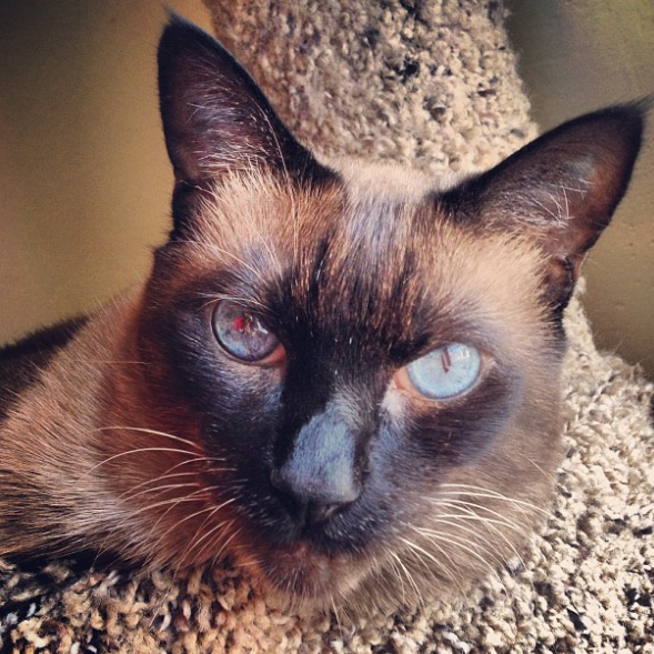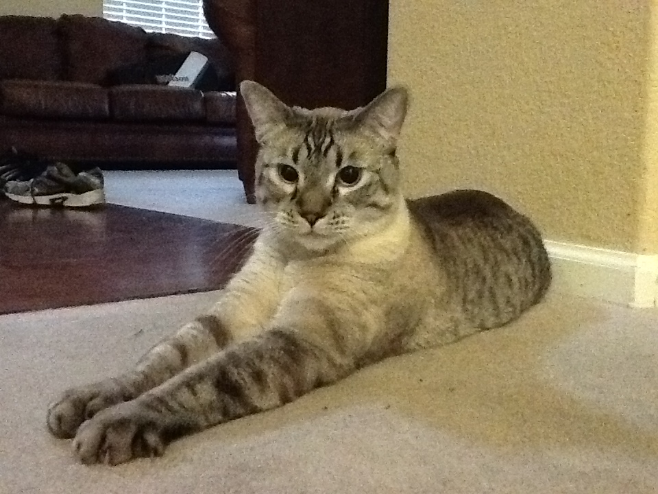 Here is our spaz cat "wheezer" - a siamese tabby. She was dumped off in a drop box overnight at the animal shelter. She had some in vitro virus so her eyes are always dialated, and she's pretty much a klutz. But, she is a very friendly cat - when she is not driving our normal kitty crazy trying to chase her everywhere.