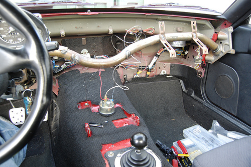I don't have many pictures of the weight savings. To be honest I haven't really done anything "new" to lose weight. Nothing in the trunk that was bolted down is there anymore, I removed the soft top, power windows, AC, PS, all of the crash protection behind both bumpers, gutted the interior and then put the carpet back in, pulled most of the climate control, ripped out most of the cabin wiring, lightweight flywheel... you know, the usual. I'm honestly at the point where I need to start cutting metal or spending money to loose more weight. I'm going to attack the doors in the very near future, but I'm loathe to spend my car budget to pull more weigh out at this point. I've been waiting a long damn time for this engine...
