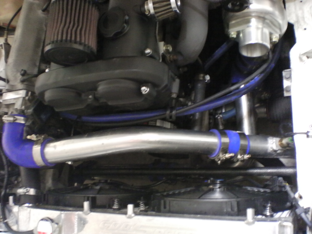Sorry for the crappy pictures. Having the 1.8 swap makes it difficult to use the ebay inter cooler kit with traditional routing because the Throttle body is so close to the upper radiator hose. I eventually want to have some one with a tig welder help me reroute it using a lot less piping.