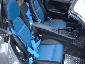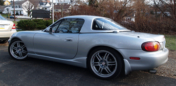 [1999 Silver Touring w/aero kit & Hardtop, foglights removed and ducted, SS Mesh Grille w/baby teeth removed, Racing Beat SS 4-1 header, Randall Cowl Intake, Magnacore 8mm wires, Roadstersport SS Midpipe, Borla SS Sport Duals, Exedy Racing Clutch, 9lb Fidanza flywheel,Tein S-tech Springs, Tokico Illumina Shocks, Kosei K1-TS wheels, Racing Beat sways w/brace kit & Cobalt endlinks,Racing Beat rear brace kit, Slotted FrozenRotors w/EBD pads, SS Braided brake & clutch lines, Double-diagonal Hard Dog rollbar, Hard Dog Harness Bar, Blue Willans Harnesses, Black/Blue high-back perforated Katzkin Leather, custom gauge cluster w/AWR components, Panasonic 75w/ch with ClearWater speakers, Blue LED dash conversion, Robbins Blue Cloth Speedline top w/glass & defroster, diamondplate Aluminum mats, ricey stickers under hood, GT2560 on it's way, "Miata" engraved on my shoelace tips and Demons running AAALLLLLL through me! ]
