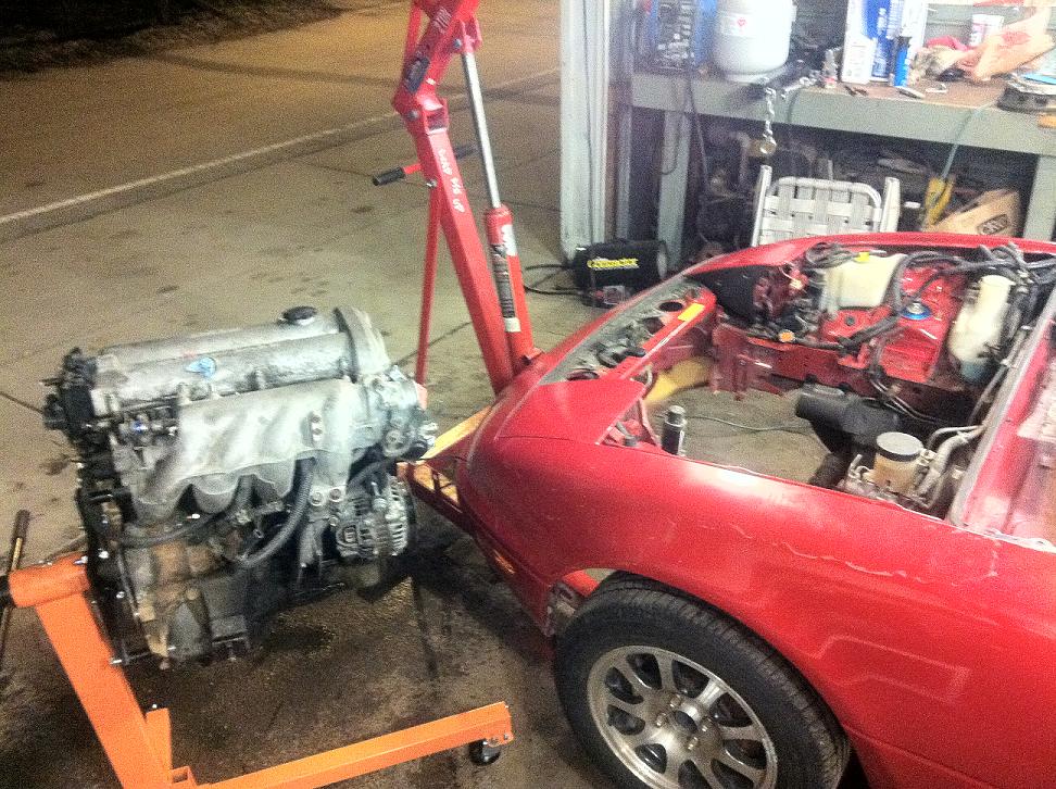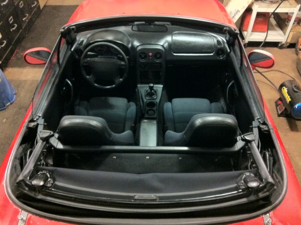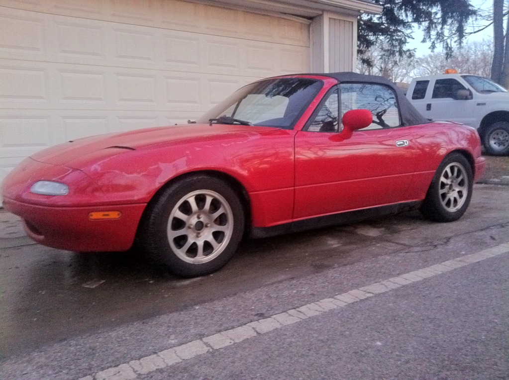 How's it going ladies and gents of Turbomiata? My name is Ryan and I am a rather new owner of a 1994 Miata that I picked up a few months ago. I had decided that I wanted a Miata but wasn't expecting to pick one up any time soon but I came across one on CL for $1000.00 which in the end I got him down to $800.00. It's a Red 1994 Convertible, 5 Speed with a 1.8L engine with 181,000 miles on it, new Black convertible soft top and a set of Megan Coilovers with about 2000 miles on them. The reason I got it so cheap was mommy and daddy wanted it out of this kid's driveway and it had a bad sounding head, bad slave cylinder, a few exhaust leaks, most of the clearcoat is gone and has some rocker rust. I bought it without question because to me all that was fixable with the knowledge I have, the people I know, and my connections.