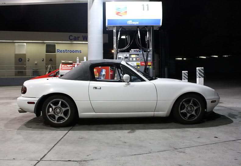I'm from Sonora, Ca in the foothills of the Sierra Nevada's, where the majority of the roads are windy and curvy as hell. I've had some fun driving it around, but had a run in with a family of deer the other night. Ended up on the shoulder which had a manzanita tree and some rocks that the Miata and I wiped out. Broken and bent some stuff, the front right tire is stuck turned toward the right. So I flat bedded it to my house and it's damage assessment time.