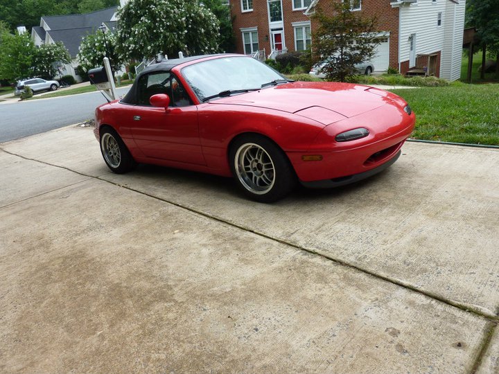 The car is a 92 base model with a 2000 1.8, has flyinmiata springs and koni yellow shocks (blown). Suspension soon to be replaced. Also turbo someday.