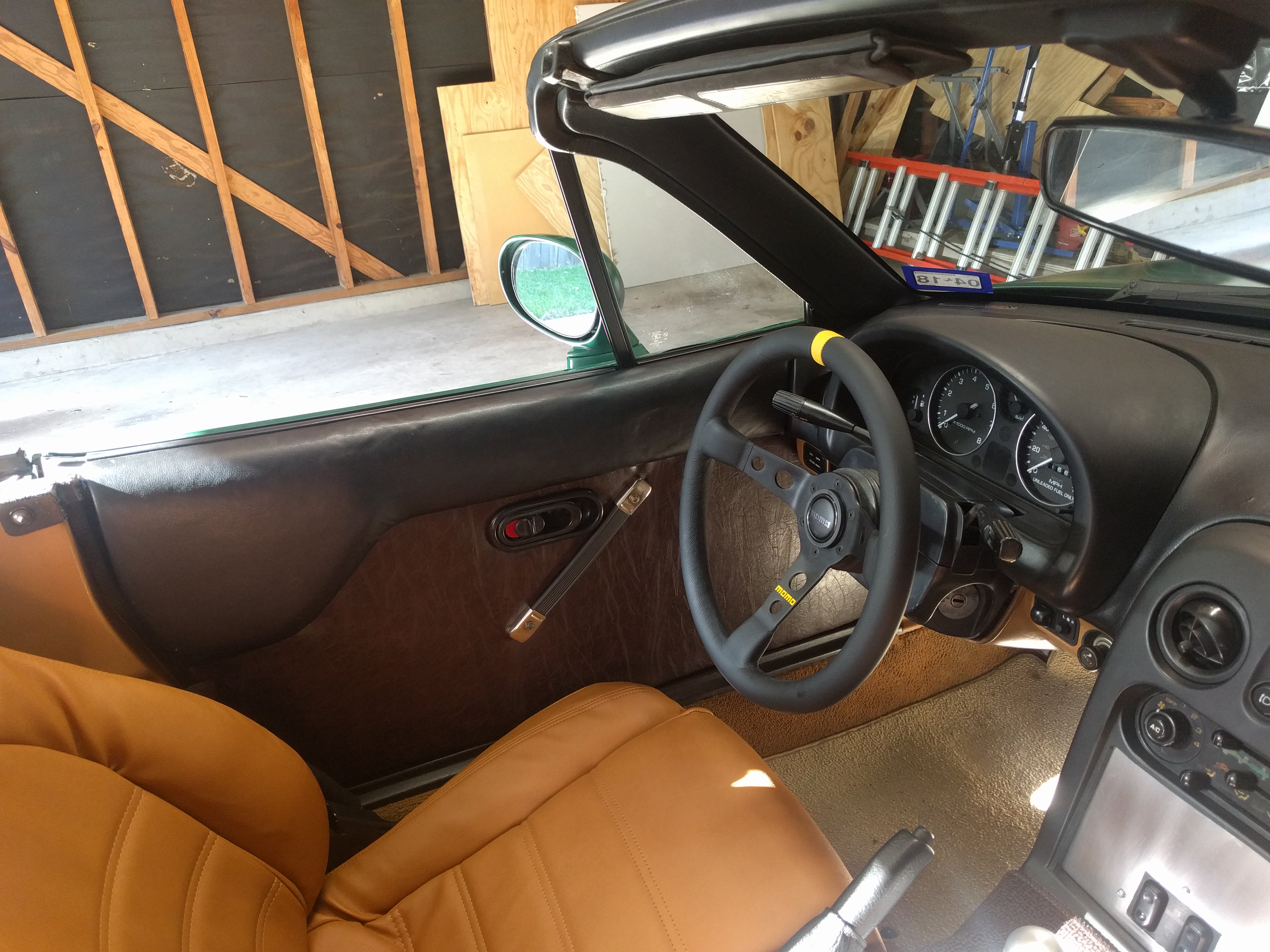 Did a little clean up on the interior: Ebay seat reupholstry (worked well for like $120), new soft top, console delete, radio delete, power window switch relocate, airbag delete, momo wheel and hub. Door card restore. Doing a retro thing.