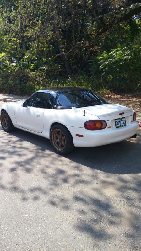So I just bought this thing last week. Its a 1999 with 100k miles. The owner before me put a muffler on it, intake, tein springs, and a nice stereo in it. I drove 5 hours to pick it up and with a quick browse of craigslist I ended up finding a mint oem hardtop and a set of rota wheels with brand new tires on my way home.