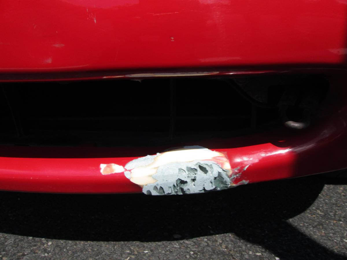 Close up of the blemish on the front bumper, done by the previous owner. I had the license plate covering it up for a bit, but I finally decided to take it off so I do my best to fix it, until either I can make it look nice or just fork out 100 bucks when one becomes avaliable. Currently going to smooth it over with another layer of body filler, then head off to the local mazda dealership to see if they have classic red miata paint.