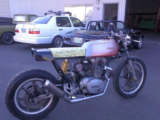 Nice! My bike looked very similar when I started, heritage special but mine had the spoked wheels, not the mags. I have a Pamco and whole new PMA charging system waiting to go in this bike when I get busy on it. The charging issues were the whole reason I took it off the road to begin with. Here is a more recent shot with the new 2 into 1 exhaust I made. Also the Jetta in the background is my daily driver.