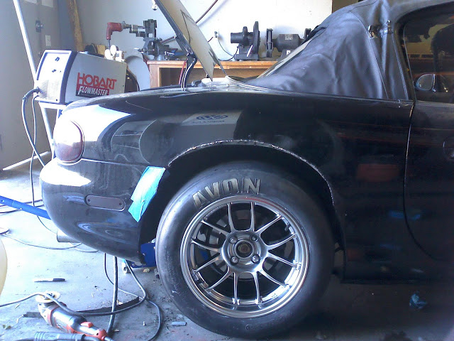 I found a good looking '99 near me that was nice and cheap. The Craigslist pictures looked good, but it had it's problems. Someone had the hood repainted without fixing any of the existing rock chips, of which there are many. The top is ripped in several places, the worst of which is right above the drivers head. Did I mention it was pretty cheap? I brought it home, cleaned it up and started driving it every day. Before autocross season started I ordered some coil overs, autokonnexion fender flares, 15x10 6ULs, and some 10 inch wide Avon slicks. The car is a lot of fun on course but lacking in the horsepower and rear traction.