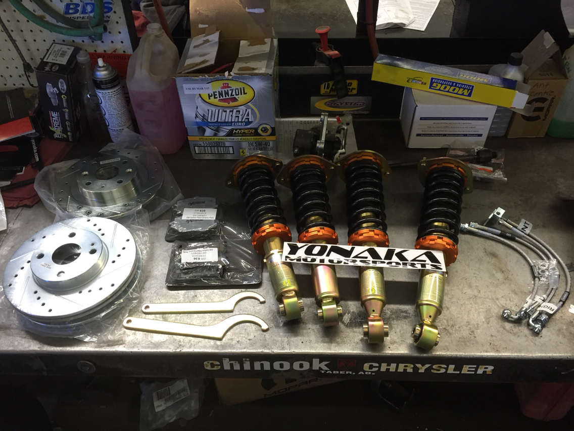 set of front and rear drilled and slotted rotors, brake pads good for 1500 celsius. Kind of overkill for me but I live close to curvey mountain roads and like the security of knowing I won’t have brake fade. Also got a set of steel braided brake lines and a set of Yonaka coilovers (they were only $450 Canadian and didn’t have any experience with coilovers before)