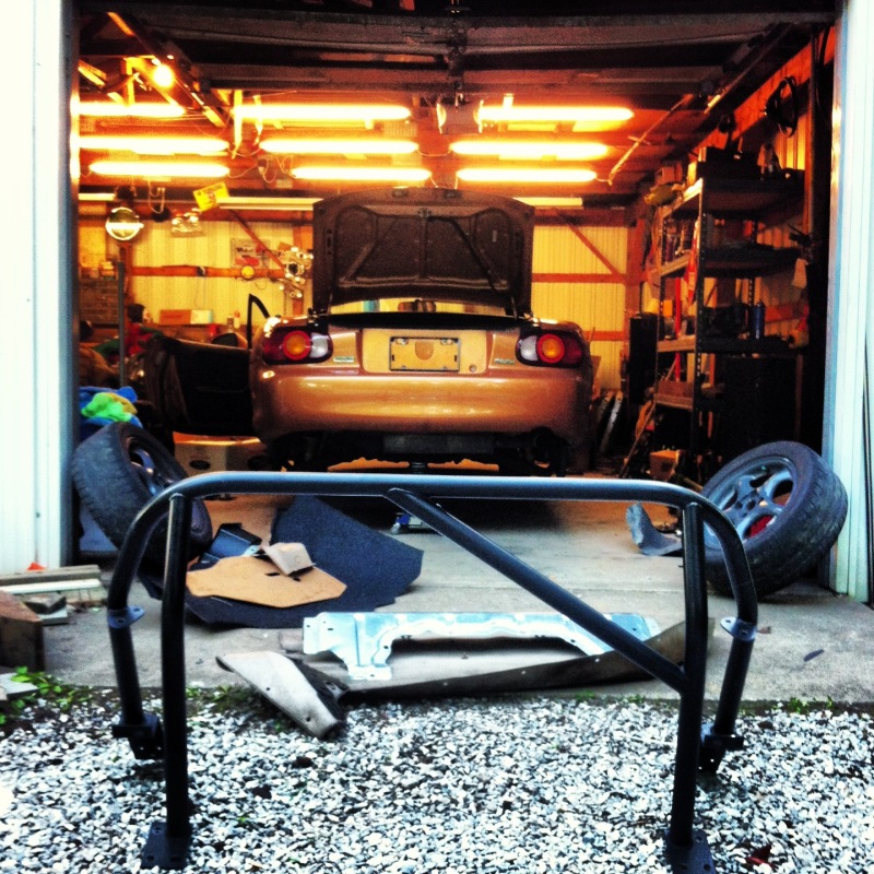 Since i will be tracking the car the current roll bar wont pass tech, so I pulled it out to replace it with a Hard Core double diagonal.