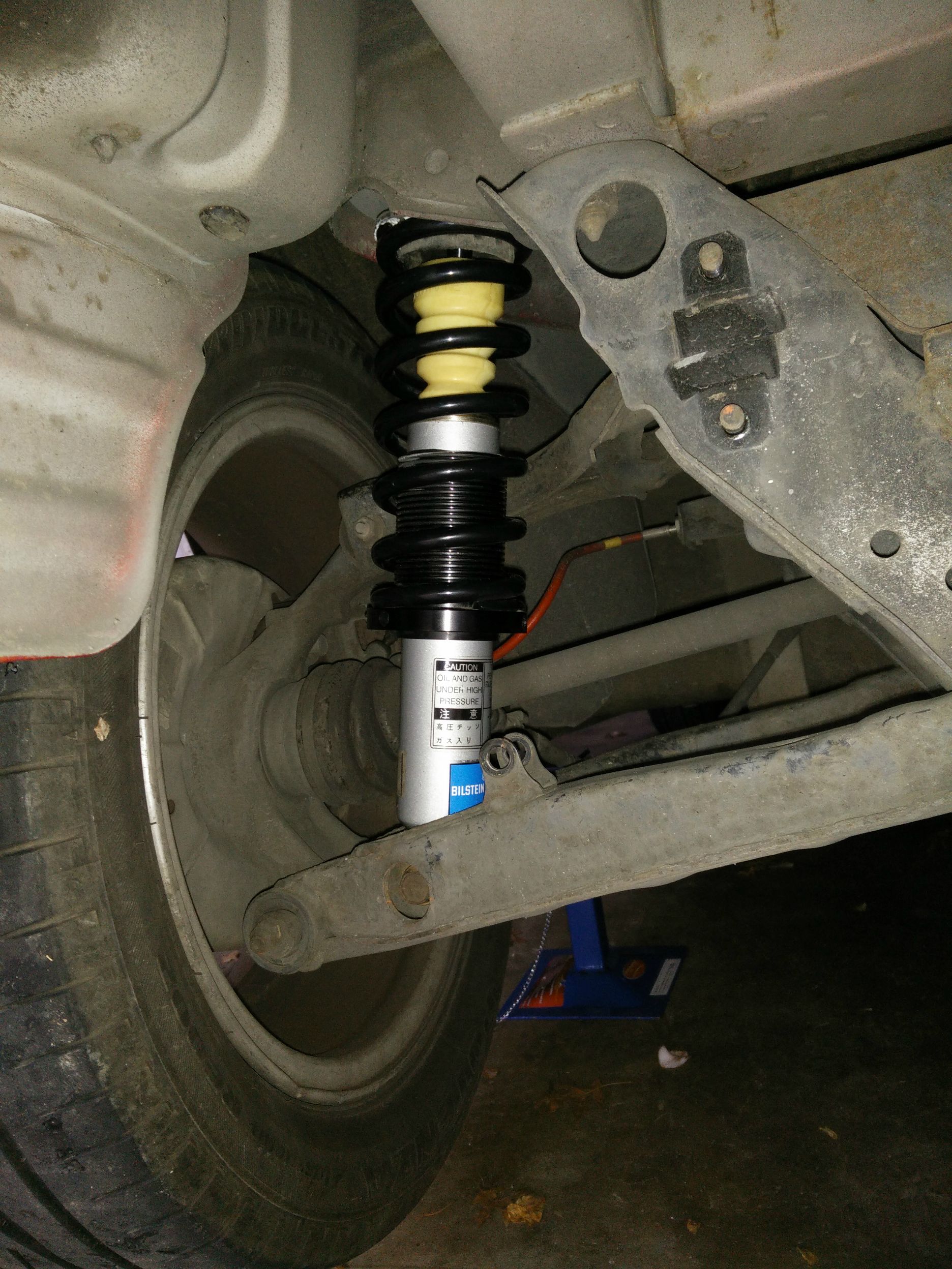Recently installed some coilover sleeves on my bilstein shocks. I used 7kg/mm 7" front and 5kg/mm 8" rear springs. I haven't measured the ride height yet but the front is around the height I want but the rear a fair bit higher and I can't drop it any further without having the spring loose pre load and drooping at full droop. I'm still using the NA top hats for the moment but will swap over to the NB top hats if I can make them fit soon. Can't wait to test them out on some twisty roads and the track.