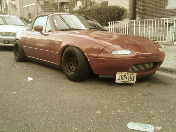 Hey there miata friends, im anthony. im 19 and from north jersey. anyway im a vwhead i guess you can say, i loved volkswagens and owned my mk4 1.8t for 3 years before trading it for my miata. i got this red 1990 miata with 110k on it from pennsylvania, on blown *** suspension, ugly montegi rims, and other nonsense. oh and a jackson racing supercharger..anyway, within the two months ive owned it, i have put raceland coils on it, bought some 14 inch bbs rz's and threw a set of toyo proxes r888s 225s on the rear (yes they look big but its the best its gonna look till i can afford something wide)..also put an OMP racing seat that i had laying around, momo small wheel, and did some camo wrap on the inside.