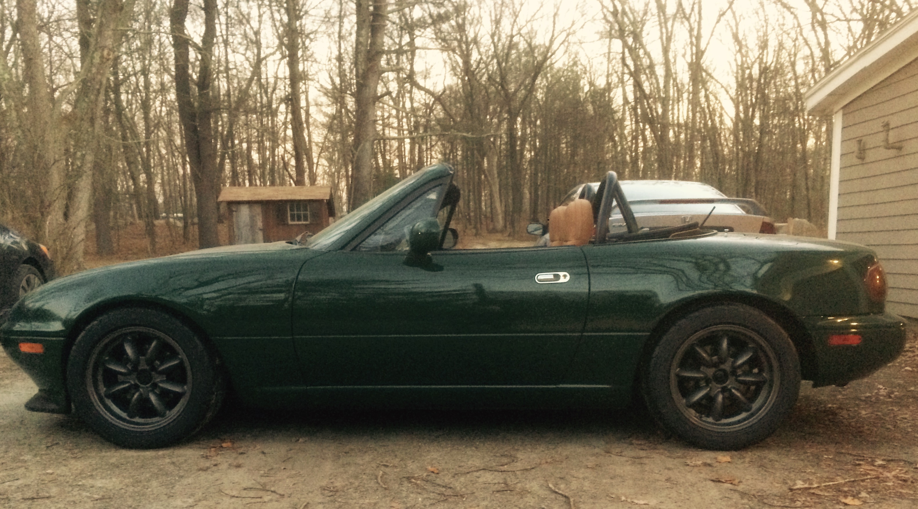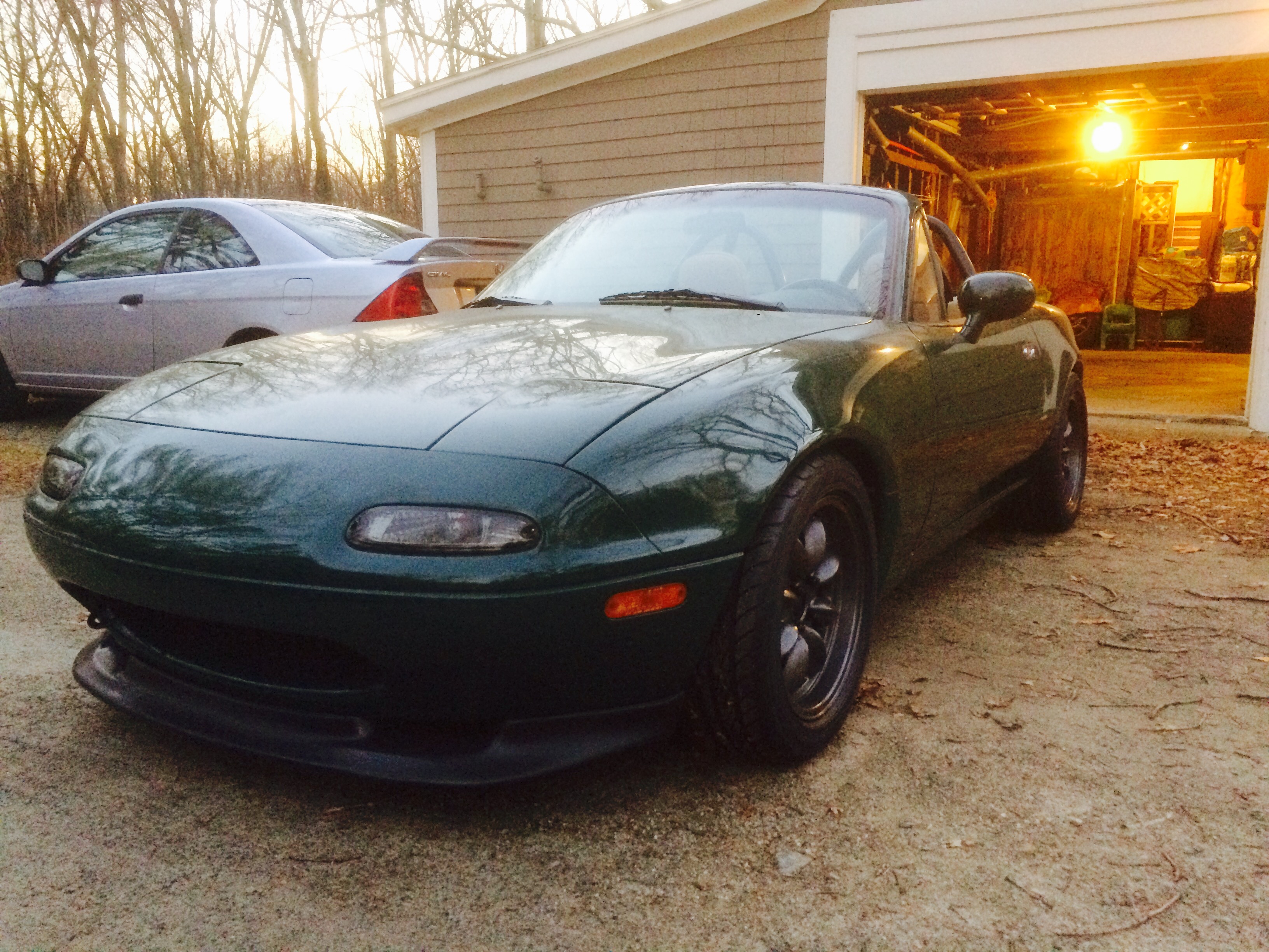 Picked up my 95 1 year ago. Florida car ( no rust!) it was red, and I painted it BRG. I reupholstered the seats, Replaced stock steering wheel with Nardi NB wheel. Installed shorty rubber antenna, smoked turn signals, GV front lip, black tow hooks, FM frame rails, vmaxx coilovers, Rota RB's, boss frog double hoop rollbar. I had to rewire the stereo, replace the intake mani gaskett, TPS, and speedo cable. Washed and painted undercarriage and wheel wells. I just purchased my wideband and boost gauges, and about to buy megasquirt! Getting ready for boost! So that's me in a nut shell. Happy new year!