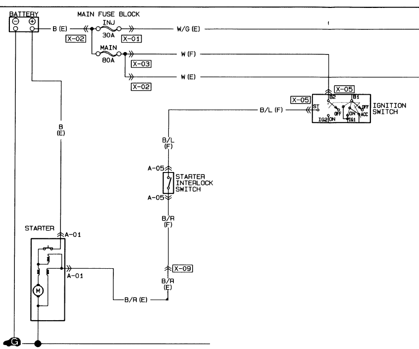 If both of these tests pass, then it suspects one switch or the other of having failed in a high-resistance state. It begins by jumpering across the two terminals of the clutch switch and attempting to start the car. Failing this, it removes the jumper and applies 12v directly to the blk/red wire at the clutch switch connector, such as from a temporary wire connected to the blue auxillary power connector under the hood near the driver's side shock tower. (It makes certain not to accidentally short this wire to ground.)