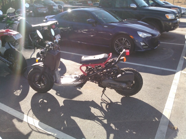It's been changed around a bit, since that pic I fixed the handlebars, switch to handlebar end mirrors, new battery box. Performance wise I installed a B&S muffler on a br header, got a mnntbx intake and installed a polini variator. After rejetting I topped out at 47 mph, but only because I'm bouncing off the rev limiter. I need to get an unlimited CDI. Neeeeeeed moooooore speeeeeed!