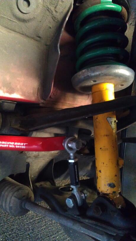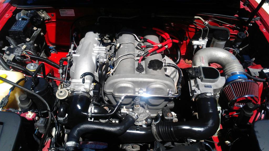 racing beat intake, koni yellows, tien springs, RB front sway bar, super miata endlinks, drilled rotors, hawk hp pads, SS braided brake lines, black bird roll bar