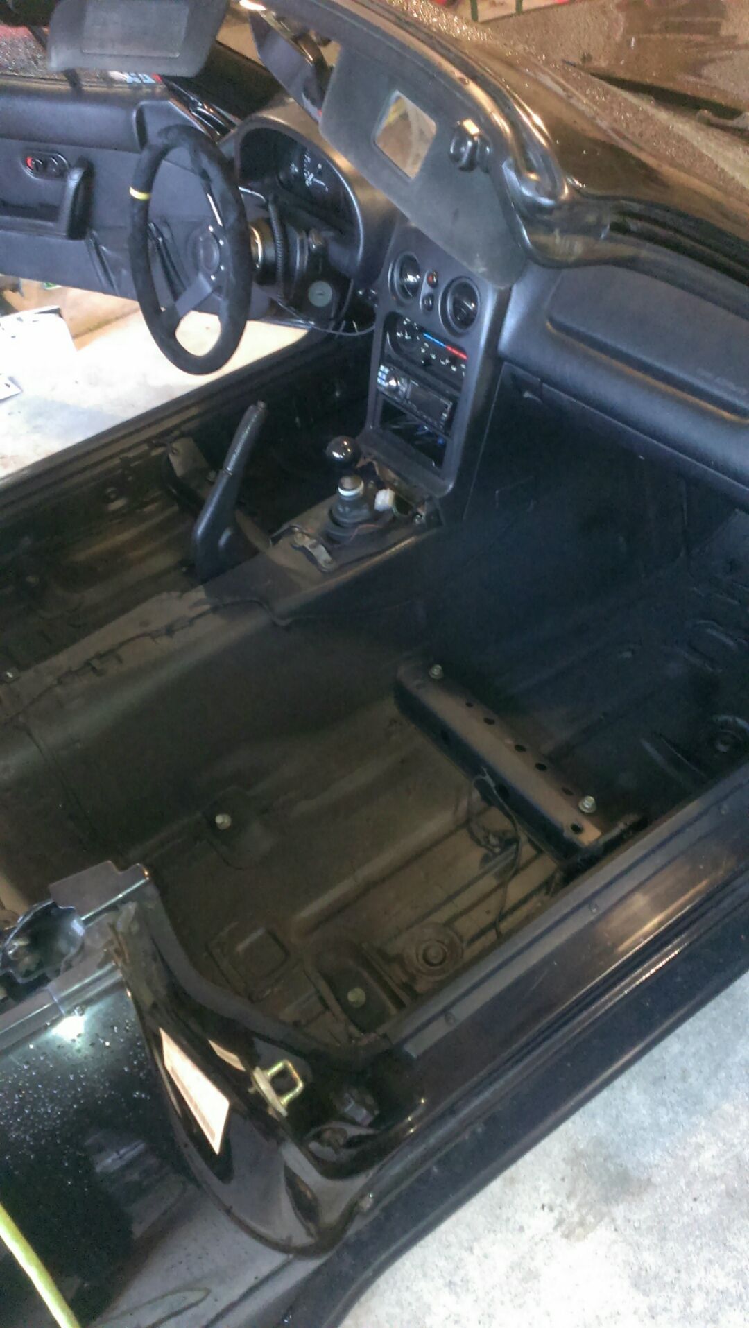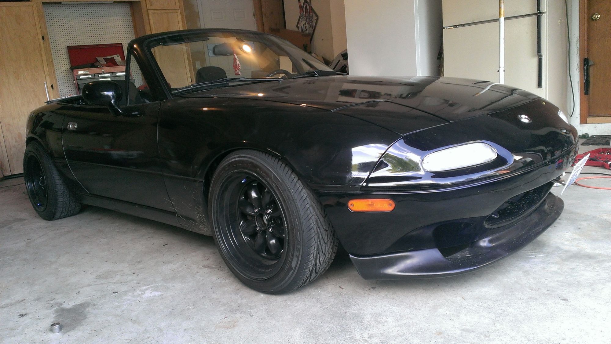 The first thing I did was replace the soft top with a brand new Robbins top, and then I ordered some Tein Street Advance Coilovers. I purchased some APR universal mirrors, a Sparco steering wheel with an NRG quick release and hub, an ebay lip and skirts, and some CBY replica AE86 fender flares.