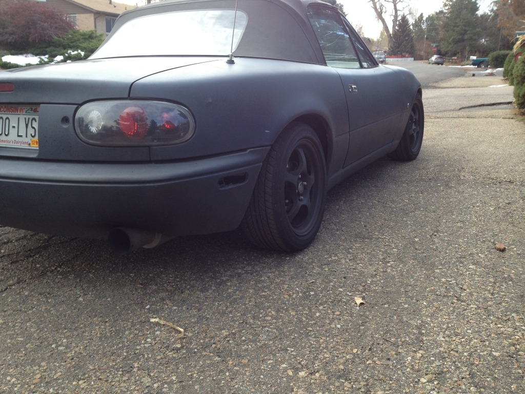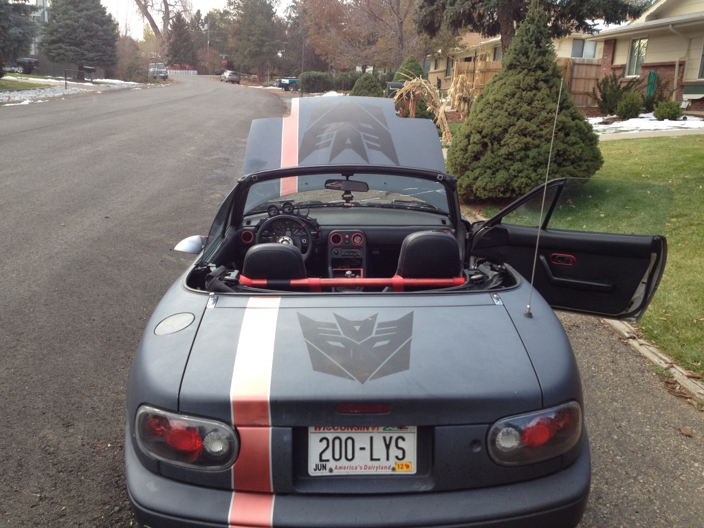 3 weeks ago i bought my first Miata, it is beat to crap, but i wanted a project so this is what i have. it is flat black with a red stripe along the drivers side of the hood. it has Decpticon stickers and badges all over it " not done by me " it has a newer top and some decent looking 15' wheels on it that are also black.