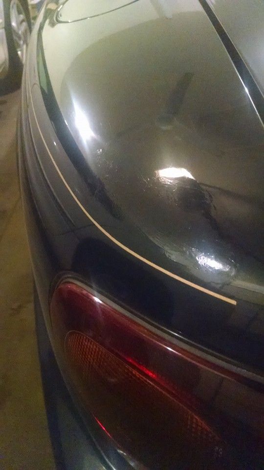 The damage may be hard to see given the quality of my **** *** phone, but there are places on the trunk where it appears that paint was slapped on with little care, slopping over the trim etc. On the hood, there are the typical rock dings, about 20 of them, but each one was filled with paint to prevent rust. The gas cap is dented, it appears that something was left on the cap before the cap was closed....