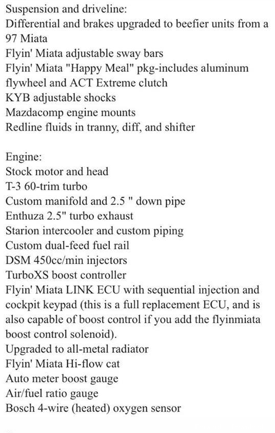 The gentleman I sold my car to helped me find a new car! He was(is) very in touch with the local Miata community, and hooked me up with a guy who was looking to offload a '92 that has a pretty nifty turbo setup. It's running a T-3 60 Trim Garret (don't know too much about it) and a LINK ECU on the 1.6 with stock internals. When last dyno'd it put 190 to the wheels at 12lbs of boost, but it seems to go up to 14 pounds. It's got various extra bracing, some sweet Fast and the Furious pillar pods, and an AFR sensor.... that displays bars instead of numbers.... I'm in the process of being nice to it this summer while I save up the cash to rebuild everything over this winter.