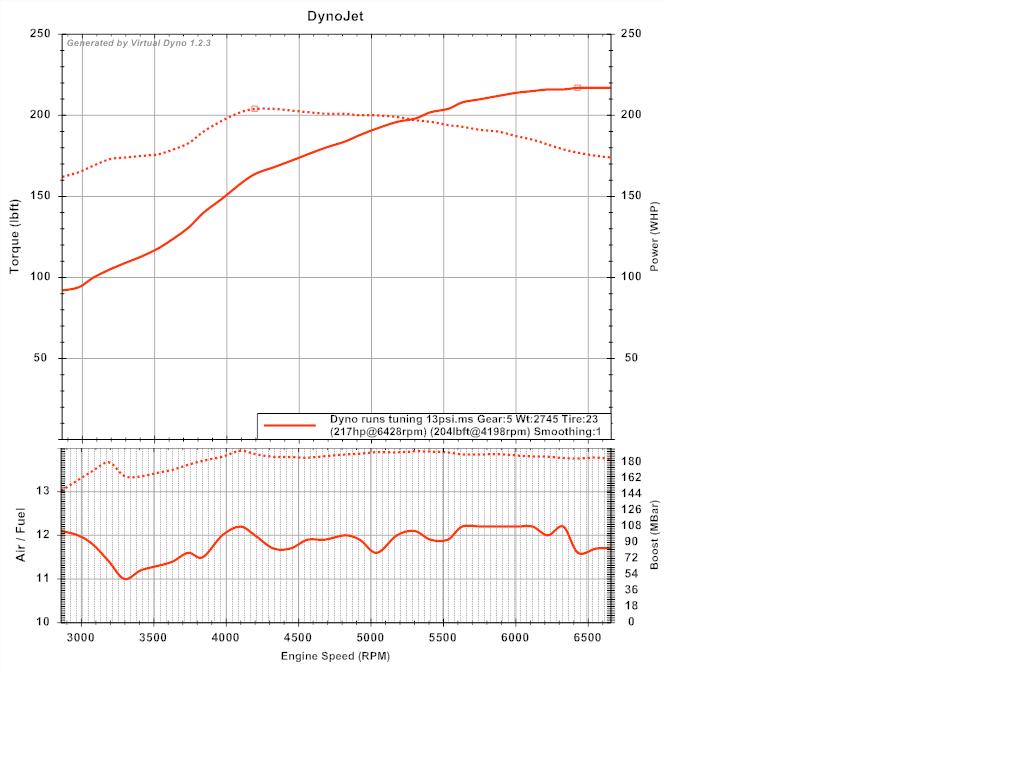 EDIT: If you look at your dyno plot you can see how the stock ECU keeps you in the high 12's until about 5k rpms. You hit max boost long before that. With the EBC hooked up I am hitting 14 psi by 3.2k rpms and holding it until redline. I'll have to link my virtual dyno for you so you can see what I am talking about.
