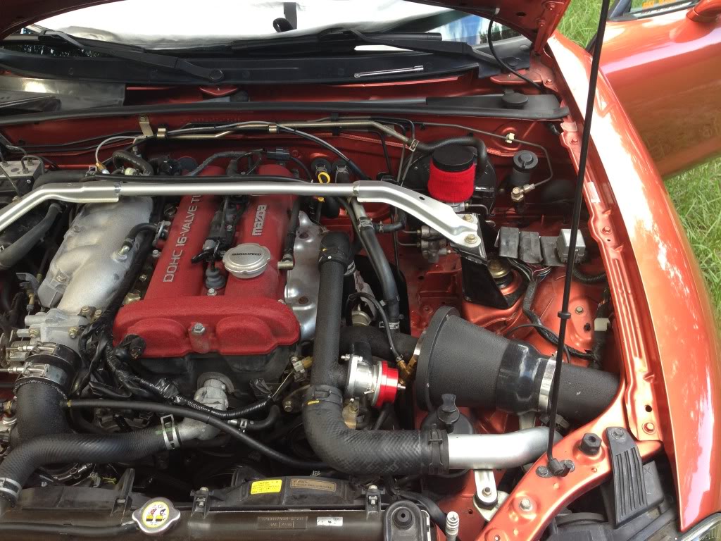 Full turbo-back exhaust came shortly thereafter. I added a 2.5" catless downpipe mated to a 2.5" to 3" Flyin' Miata Mazdaspeed exhaust. Sadly the only picture I have of the exhaust is the one I took of it strapped to my rollbar on the way to get installed.
