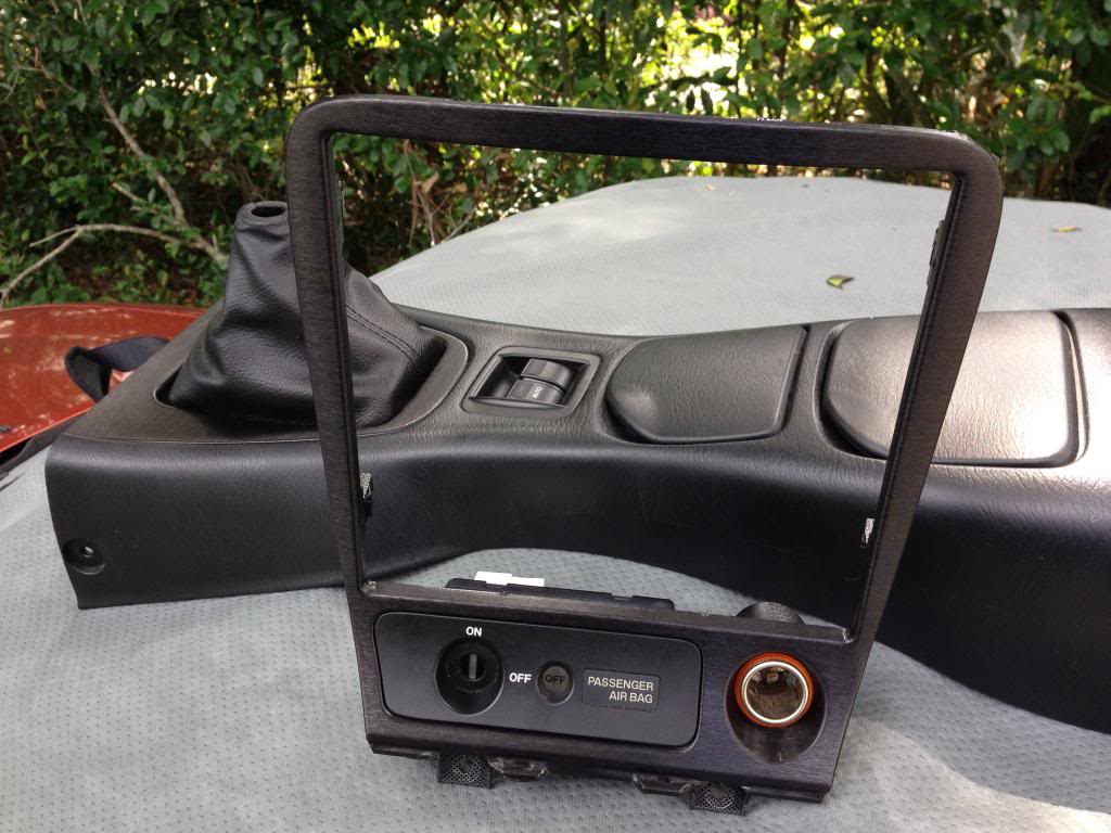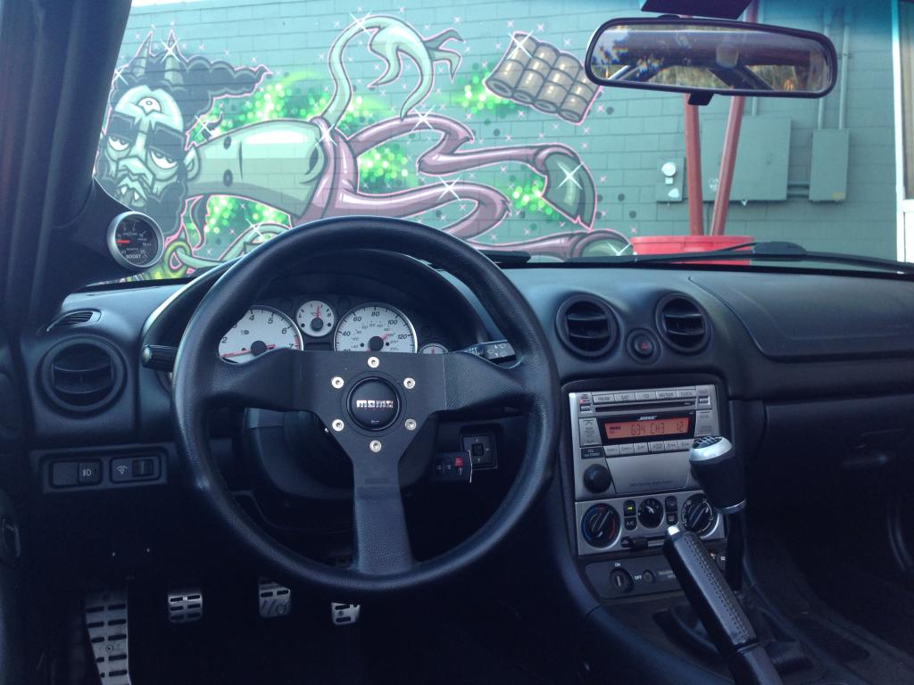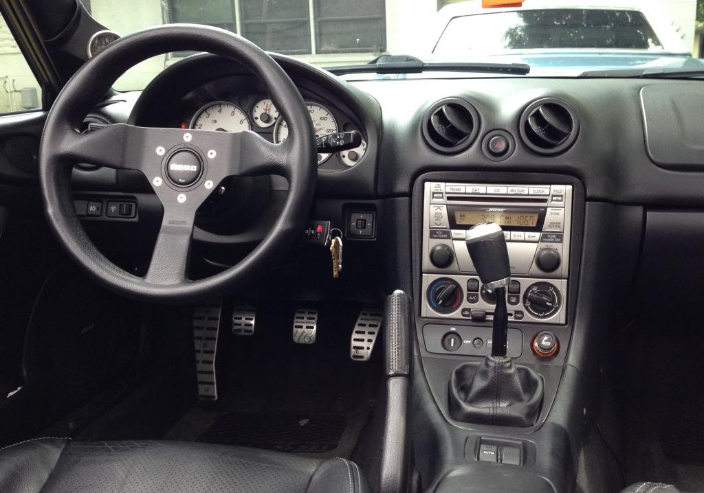 I wrapped the radio and shifter surround with some black brushed aluminum vinyl to cover up the awful factory faux carbon fiber look, and also to match my new 320mm MOMO Monte Carlo. Also pictured is my new Miata Roadster short shifter with angled extension, and a factory NC Miata shift ****. Another new mod visible here are my Mitsubishi Eclipse air vents, which I am also in love with.