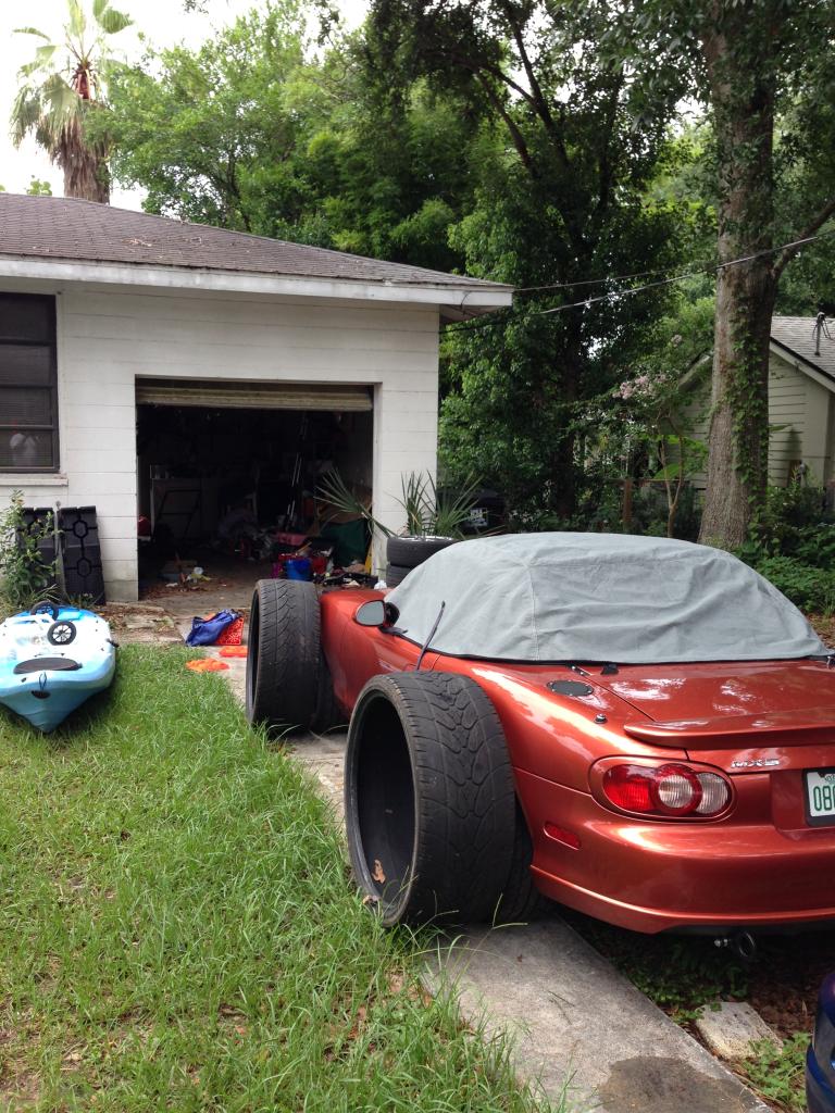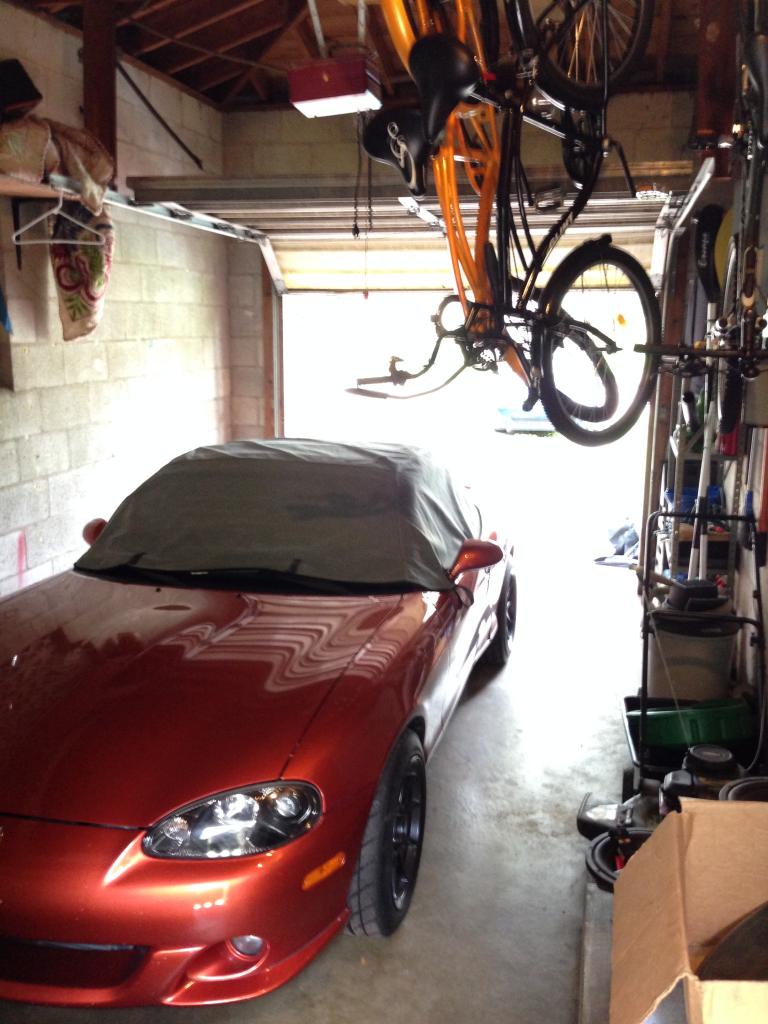 Cleaned out my garage and played around with some 26" tires left behind by an old roommate. Now the Miata finally has a roof over its head and I can easily maintain the incredible shine brought forth by the paint sealant.