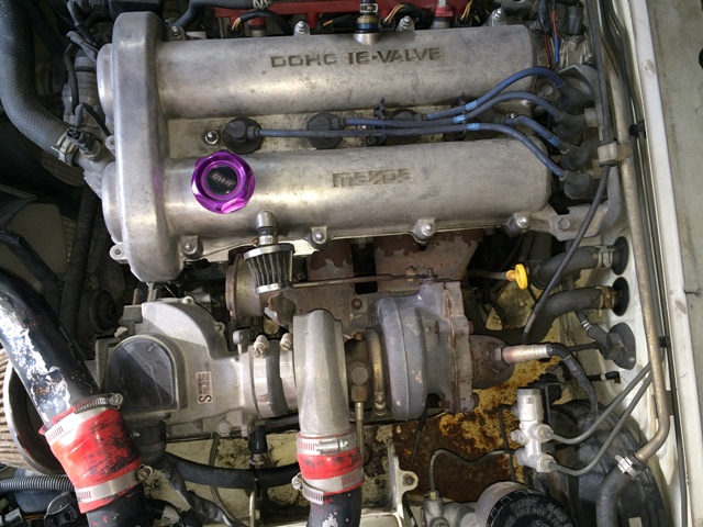 , and the owner Cody Epp is a great young man, who loves his Miata's. My wife was getting Cody to do some repair work on her truck, saw the white Miata, asked about it, and bought it as a surprise for my birthday. Cody and our younger son did some work on it to get it road ready. As a first time Miata owner, and not having done all my usual overly detailed analysis of everything before hand, I find myself at a bit of a technical dis-advantage. Hence, here I am. The VIN number describes the car as a 1990 made in Hiroshima for the US market. Now I know that the turbo was NOT an option in 1990, so I am faced with a question (at least one question; probably LOTS more as I get into this a little further).If the VIN number says that the chassis was made in 1990, and that the stock engine was a 1.6 L naturally aspirated,